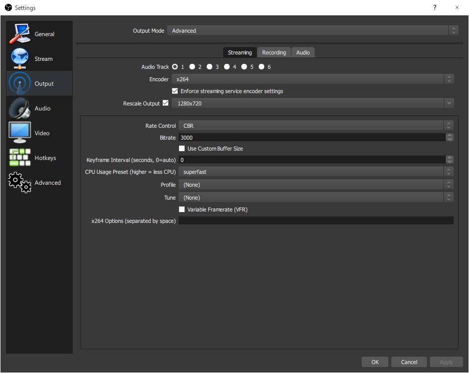 Rescale Output: 1280x720 - This resolution offers good parity between quality and performance, depending on the provided bitrate (covered later).